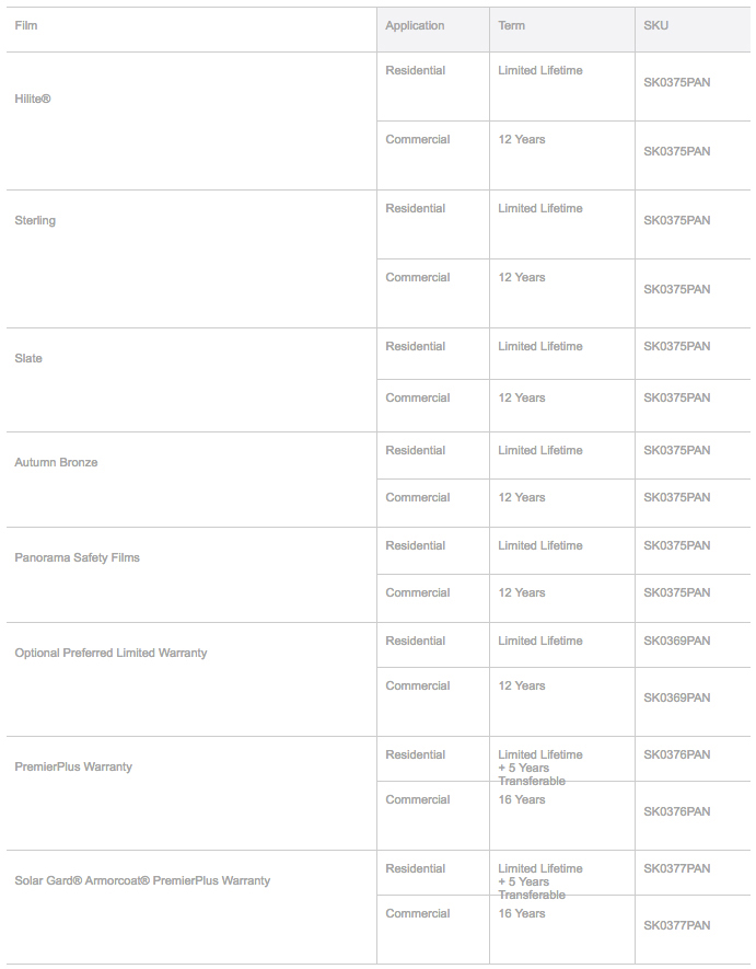 Panorama warranties and term lengths presented in this website are only applicable to the United States and Canada. All Panorama products carry a manufacturers warranty and are specific to the type of architectural installation: residential and commercial. Different films and applications may carry different warranties. For detailed information regarding our warranties, please contact your local authorized dealer. Click here to locate you local dealer or refer to our warranty table.